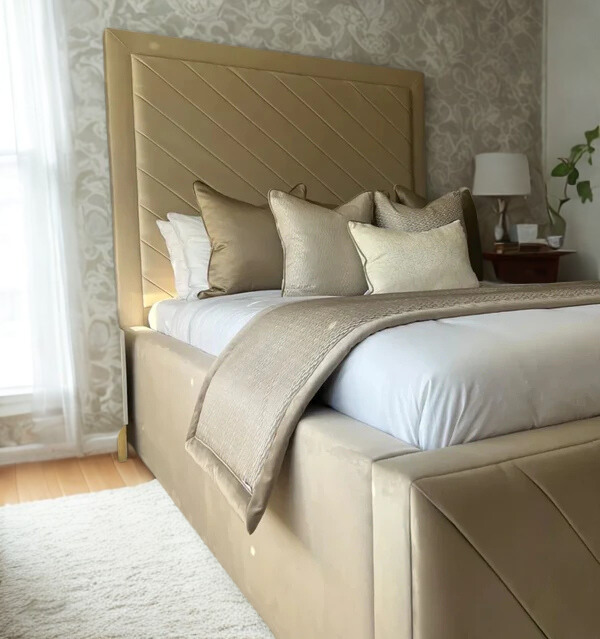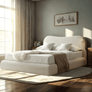 The Austen Bed Frame blends modern design with luxurious comfort, showcasing a streamlined headboard wrapped in soft, textured upholstery. Its low-profile frame adds a contemporary feel, while the durable slatted base provides dependable support. Elegant yet understated, it’s perfect for those who value simplicity and style.