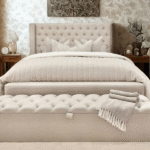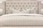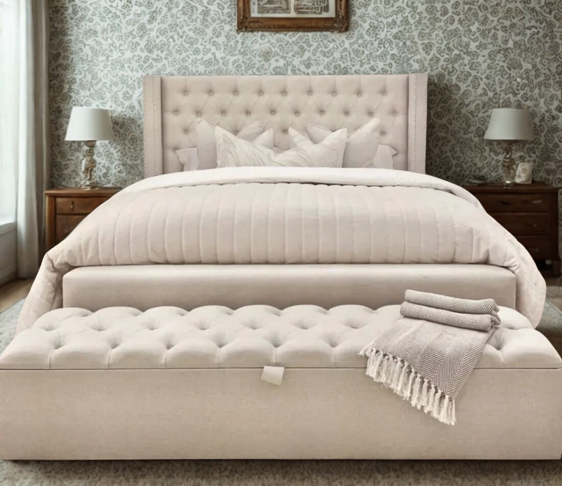 The Richmond Luxury Bed with Stud Detailing is a stunning focal point for any bedroom. Its tall, winged headboard features deep button tufting and carefully hand-applied studs, exuding elegance and sophistication. Upholstered in sumptuous, premium fabric, it adds a luxurious touch to your space. The durable slatted base offers reliable support and comfort, while the classic design effortlessly complements both traditional and contemporary interiors.