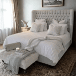 The Royal Bedframe is designed with sweeping, individually upholstered panels accented by a refined border, offering a sleek and modern look. Its side rails are luxuriously padded and crafted taller than standard frames, complemented by a matching panelled footboard for a cohesive finish.