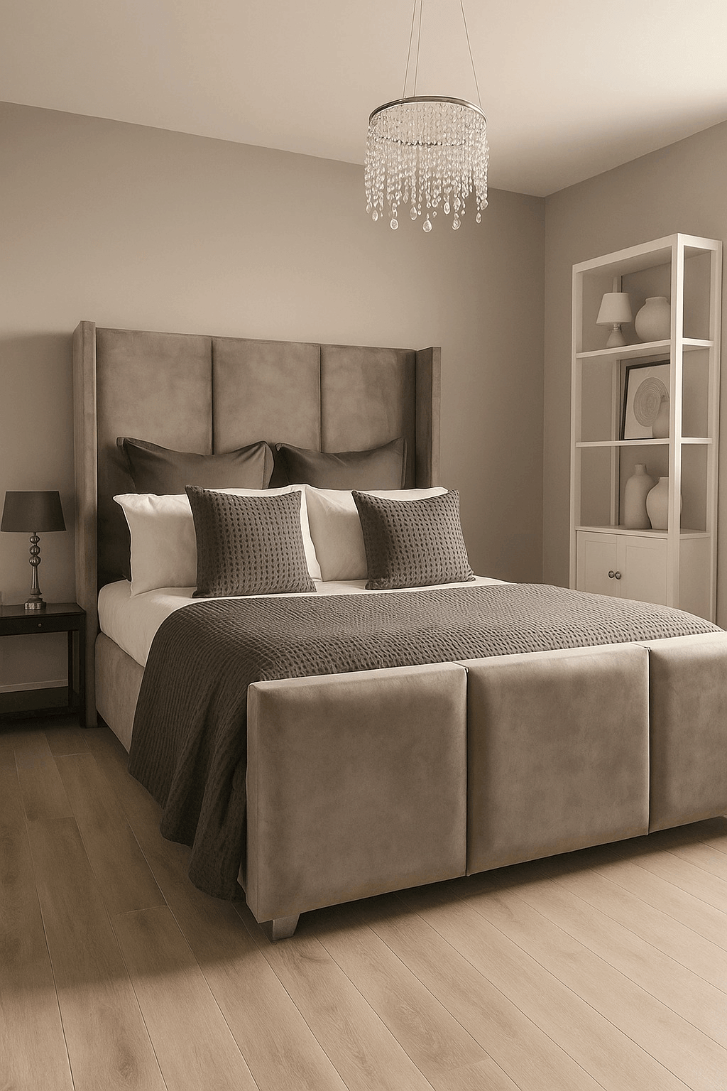 The Ruby Luxury Bed is designed with sweeping, individually upholstered panels framed by a refined border, delivering a sleek and modern aesthetic. Its side rails are generously padded and stand higher than standard frames, complemented by a coordinating panelled footboard for a complete, harmonious look.
